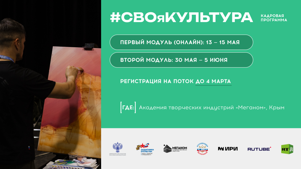 Открыта регистрация на программу «#СВОЯКУЛЬТУРА» для участников и ветеранов специальной военной операции, а также членов их семей. Первый поток программы пройдёт с 13 мая по 5 июня и будет включать два модуля: онлайн-модуль и очный модуль в Академии творческих индустрий «Меганом» (проект «Таврида.АРТ»). Программа реализуется при поддержке Министерства культуры Российской Федерации и фонда «Защитники Отечества». Регистрация продлится до 4 марта на сайте арт-кластера «Таврида»: https://clck.ru/3R2SHX